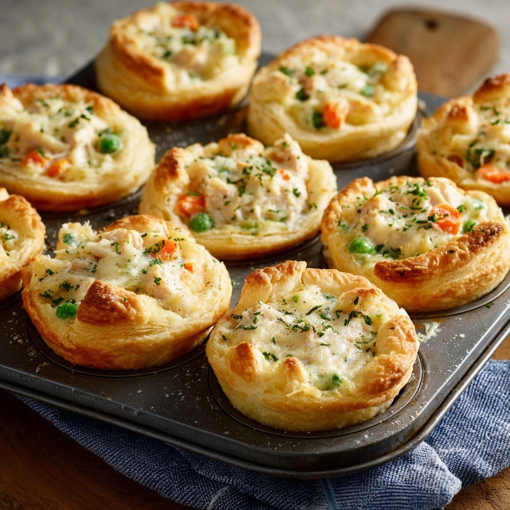 Picture this: a golden crust that cracks like brittle ice when you press it, revealing a steaming, savory filling that oozes out like a velvety gravy. The aroma of thyme, garlic, and melted butter lingers in the air, while the sound of the muffins rising in the oven is the soundtrack of a culinary triumph. The texture is a delightful contrast—crisp on the outside, tender and creamy on the inside. You’ll taste the subtle sweetness of caramelized onions, the earthy bite of carrots, and the umami punch of chicken broth, all wrapped in a buttery, flaky dough.
